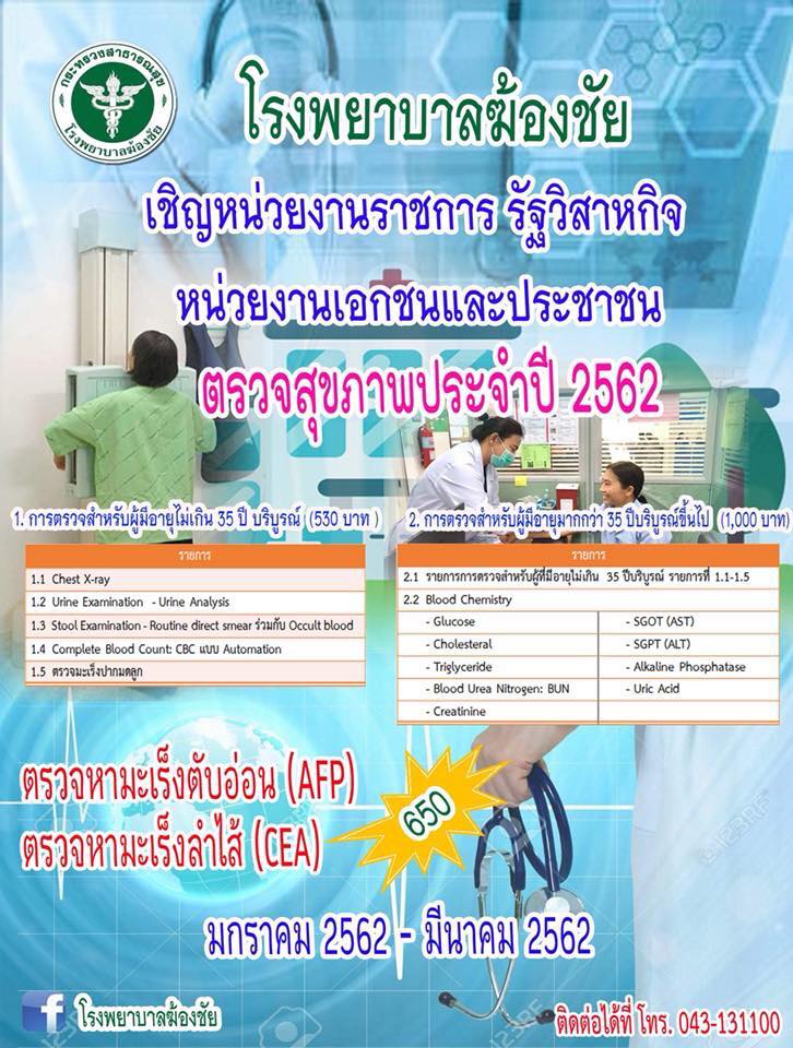 โรงพยาบาลฆ้องชัย ขอเชิญบุคลากรส่วนราชการ รัฐวิสาหกิจ เอกชนและประชาชน เข้ารับการตรวจสุขภาพประจำปีงบประมาณ 2562 ณ โรงพยาบาลฆ้องชัย