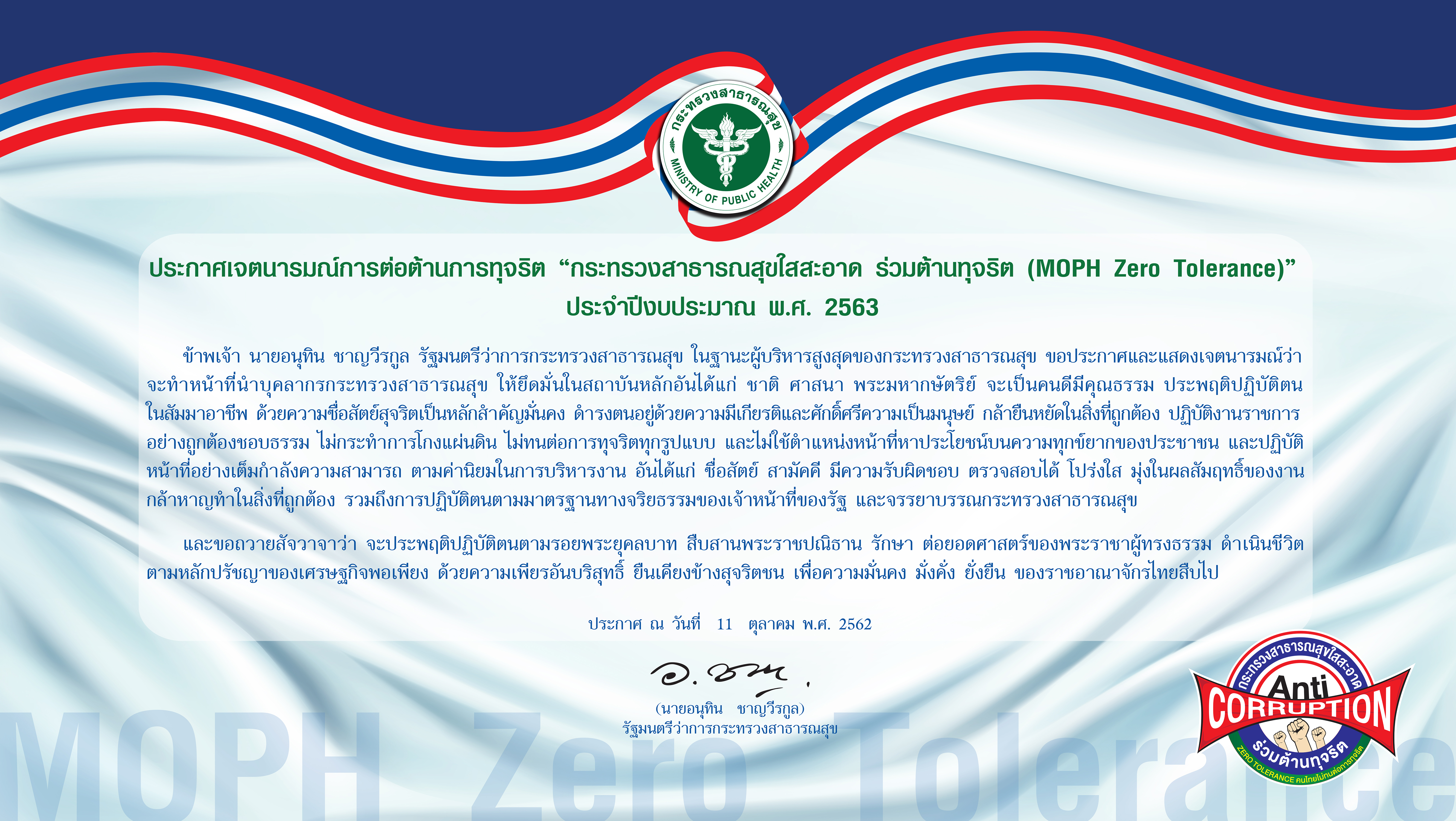 ประกาศเจตนารมณ์การต่อต้านทุจริต “กระทรวงสาธารณสุขใสสะอาด ร่วมด้านทุจริต (MOPH Zero Tolerance)” ประจำปีงบประมาณ พ.ศ. 2563