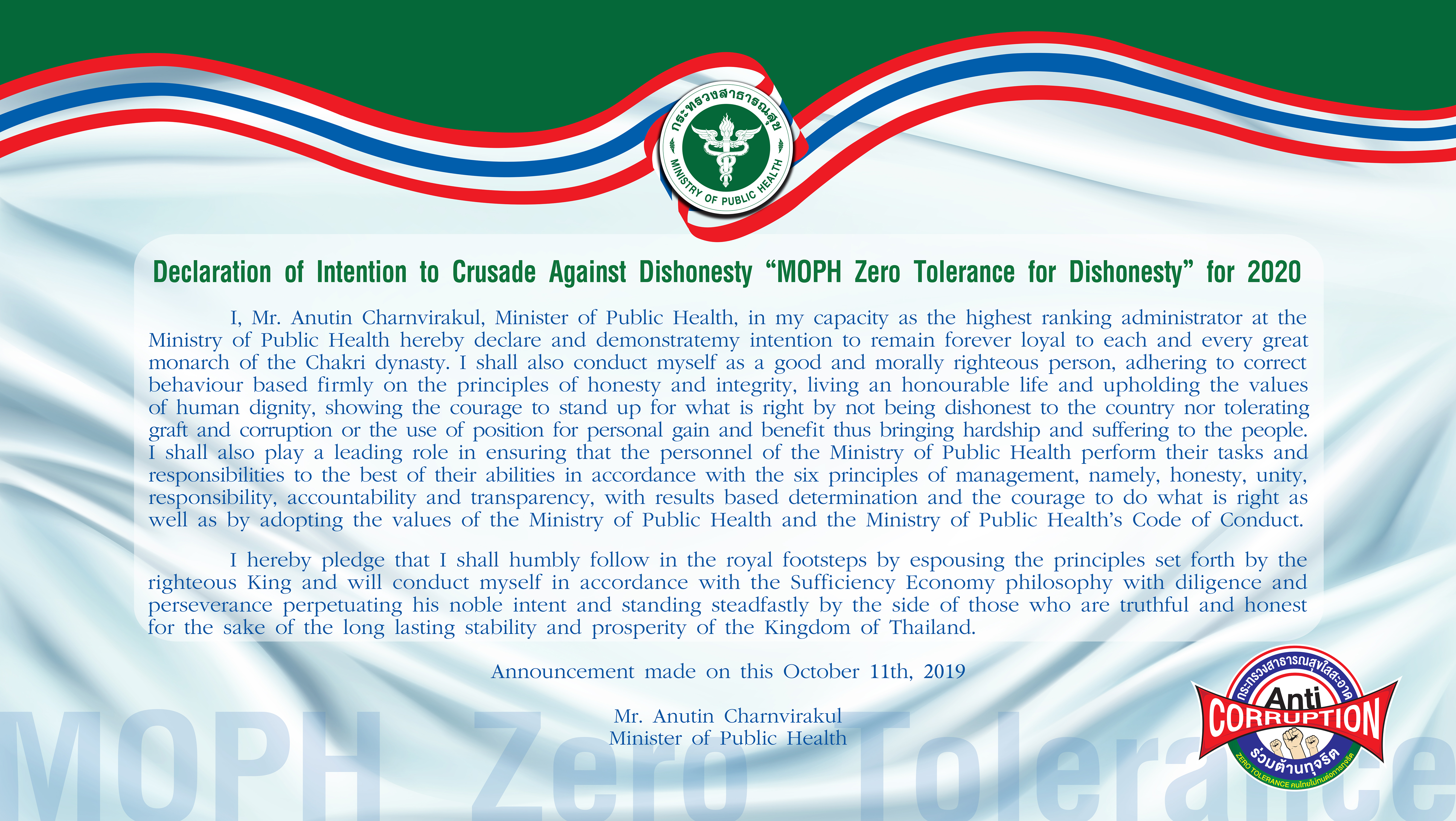 Declaration of Intention to Crusade Against Dishonesty “MOPH Zero Tolerance for Dishonesty” for 2020