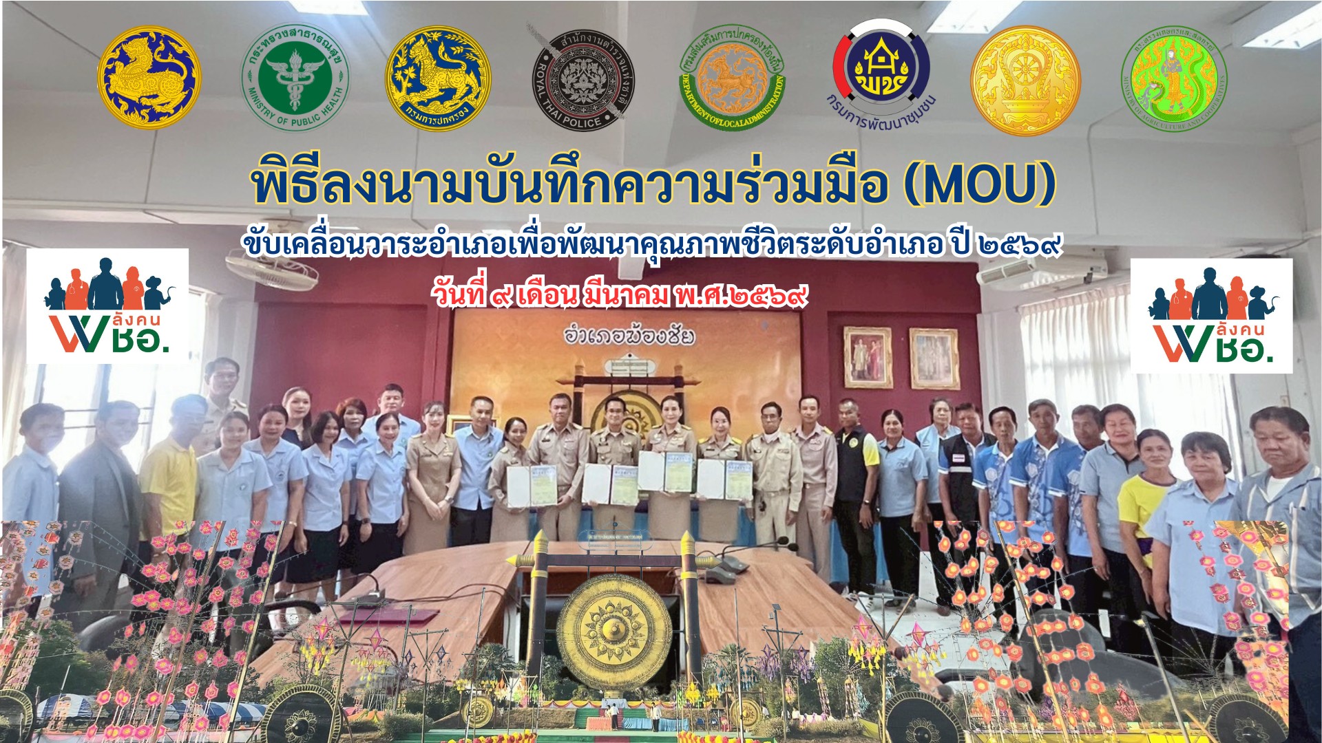 วันที่ 9 มีนาคม 2569 คณะกรรมการพัฒนาคุณภาพชีวิตระดับอำเภอ (พชอ.) นำโดย นายปัญญา ประโพชะนัง นายอำเภอฆ้องชัย เป็นประธานพิธีลงนามบันทึกข้อตกลงความร่วมมือ การพัฒนาคุณภาพชีวิตระดับอำเภอ (พชอ.) และ พชต. ประจำปี 2569 พร้อมด้วยคณะอนุกรรมการ หัวหน้าส่วนราชการ ผู้บริหารองค์กรปกครองส่วนท้องถิ่น ผู้นำชุมชน เพื่อให้เกิดระบบและกลไกการขับเคลื่อน การประสานงานการพัฒนาคุณภาพชีวิตระดับอำเภอ (พชอ.) และ พชต. เป็นไปอย่างเรียบร้อยมีประสิทธิภาพและประสิทธิผล